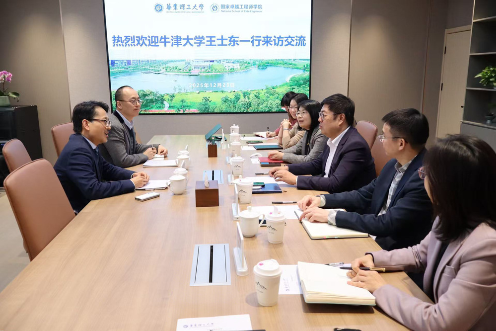 12月23日,牛津大学展望与全球研究院院长王士东一行来校走访,就国际交流与合作等事宜进行交流座谈。会前,华东理工大学党委书记蒋传海会见了王士东一行。校党委副书记沈海涛出席座谈会,国家卓越工程师学院党委书记兼常务副院长张雪芹,国际合作与交流处副处长詹望成参加会议。