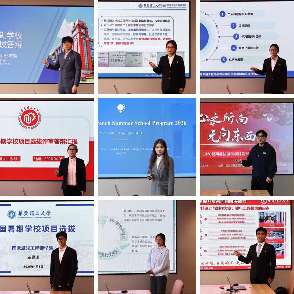 本次暑期学校由法国盖-吕萨克联盟(FGL)与法国米卢斯国立高等化学学院(ENSCMu)联合组织。项目选拔采取学生申请、学院审核、现场答辩的形式进行。9名申请人围绕个人学术背景、科研实践经历、对项目主题的理解及学习规划等方面进行汇报。评审专家从专业素养、综合能力、外语水平及发展潜力等维度进行现场提问与打分。